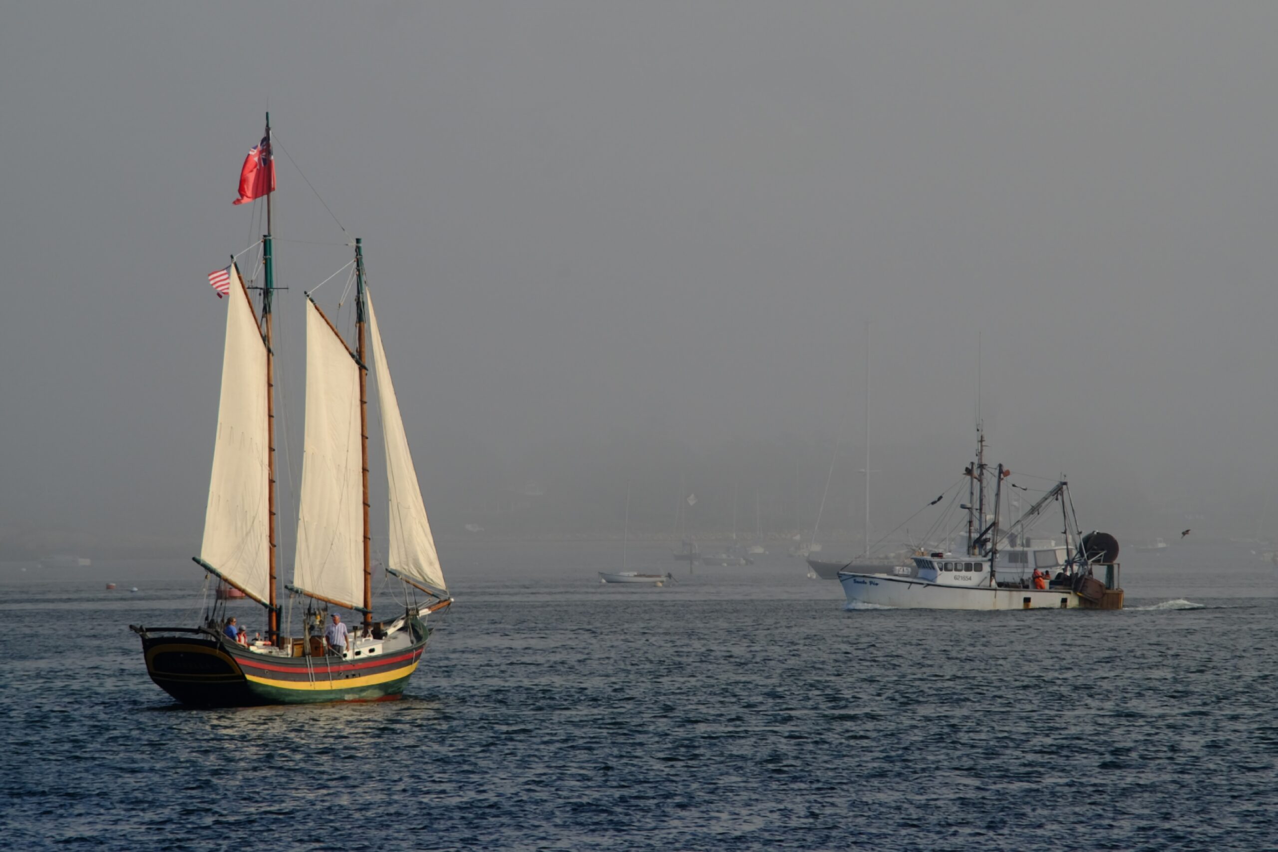 The two ships pass, similar purposes originally, now one yearning for what it used to be. Will it ever move like it did, fishing as it once did? Is it destined to simply be a ship for relaxing now, a workhorse tamed with the advancement of technology?