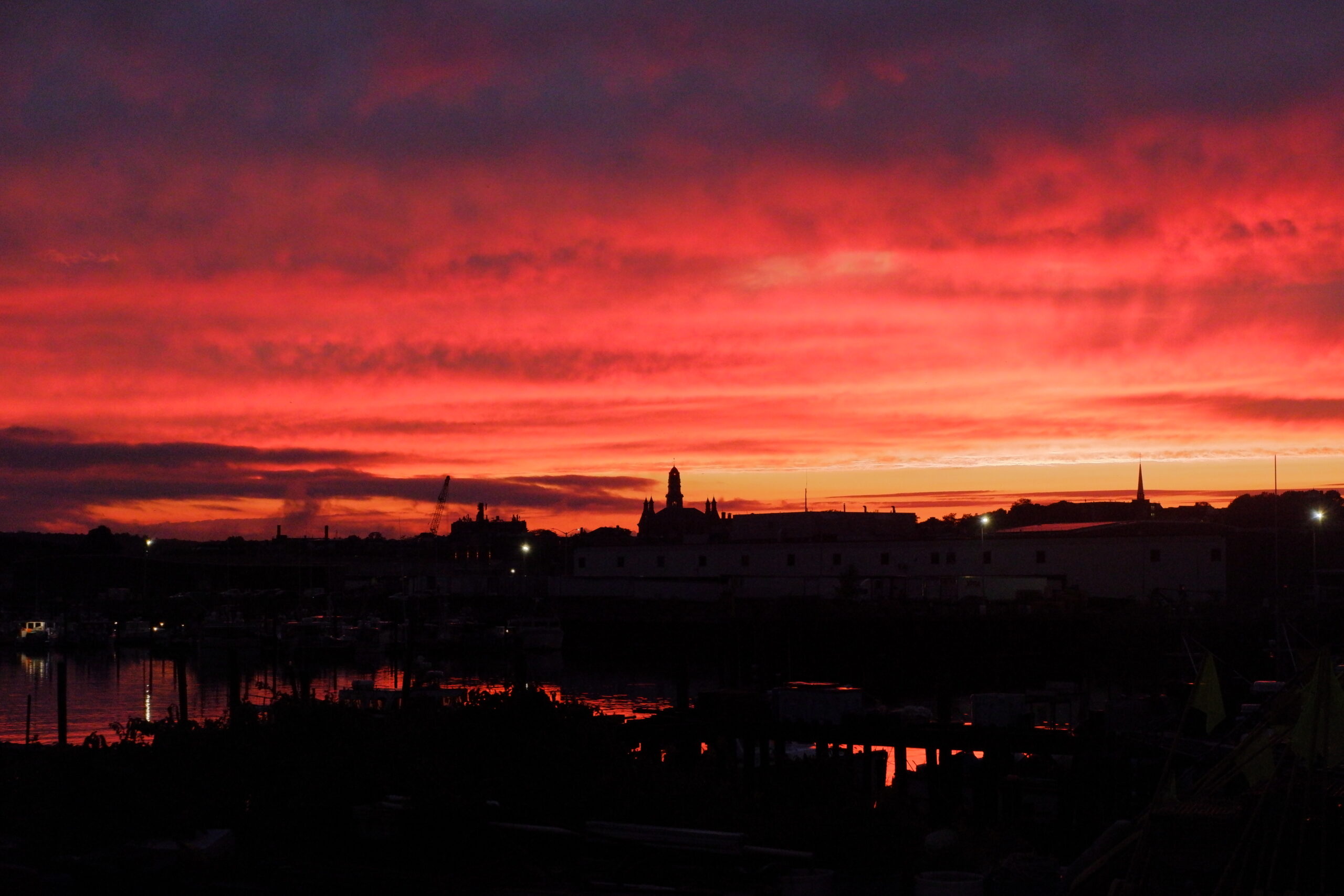 Upon the clouds of dusk, the Sun says goodbye. Brilliantly, over town hall, it lights the sky up once more. A parting, a farewell. The flares of color move through the clouds, dancing solemn tunes.